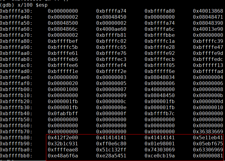 0xbffffb8d 에 쉘코드가 들어있는 것을 확인해 볼 수 있었다. ( little endian : \x8f\xfb\xff\xbf )