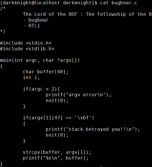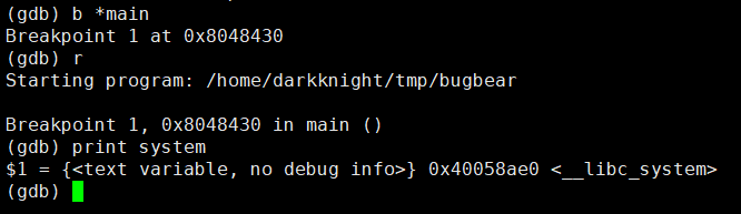| buf[40] + dummy[4] | SFP[4] | system() | dummy[4] | /bin/sh |