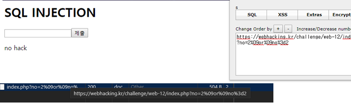 처음에 입력 폼에 2%09or%09no%3d2 이렇게 띄워쓰기 대신 탭문자 와 = urlencode 해서 넣어보았는데